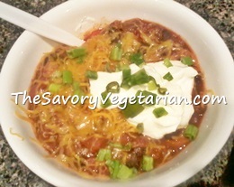 Traditional Vegetarian Chili Meal - Serve it with a nice, warm piece of corn bread or with some of your favorite crackers and top it with your favorite chili toppings. So delicious you won't even miss the meat. Need I say more?